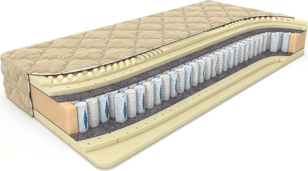 Над пружинным блоком расположены два вида натурального латекса, что дает возможность равномерно распределить вес тела. Над пружинами располагается слой перфорированного латекса, за ним идет самый верхний комфортный слой - латекс массаж. Это помогает позвоночнику принять правильное положение.