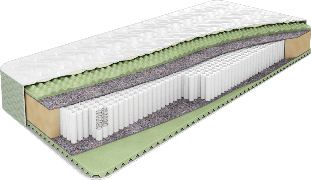 Матрас изготовлен из массажной пены ErgoFoam с обеих сторон, что обеспечивает комфорт и расслабляющий массажный эффект во время сна. Внутри матраса расположен пружинный блок S 2000 с независимыми пружинами, который даёт индивидуальную поддержку для каждого участка тела. Число 2000 обозначает количество, что на каждый квадратный метр приходится около 1000 пружин, которые обеспечивают надёжную ортопедическую поддержку спины и удобство отдыха в любом положении и выдерживают вес до 160 кг и подходят людям с весом больше среднего. Чехол матраса выполнен из объемного простеганного трикотажа (ортопена), который придаёт приятные тактильные ощущения и хорошую воздухопроницаемость. Боковина из простеганной ткани букле добавляет элегантности и стиля.