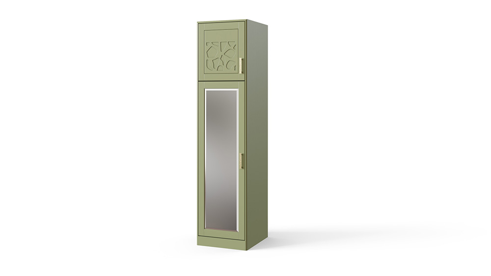 Шкаф производится с антресолью в верхней или нижней части шкаф. В стандартном исполнении в большей створке шкафа расположено зеркало с фацетом, которое выполняет роль филенки в фасаде, по желанию возможна установка дверей из 100 % массива дерева. Корпус шкафа изготавливается только из массива бука или ясеня. Одностворчатый шкаф идеально подходит для составления мебельных композиций в качестве модульного элемента. Авторская резьба на фасадах шкафа делает его произведением мебельного искусства. Распашные дверцы шкафа оснащены петлями с системой дозакрытия в базовой комплектации. Стандартно предусмотрено две комплектовки шкафа: с антресольной секцией вверху или внизу. По желанию шкаф может быть оснащен любым количеством полок. Требуется сборка.