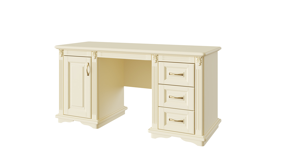 Стол руководителя Палермо - Новинка в коллекции мебели для спален от фабрики DreamLine. Стандартно, данная модель изготавливается с тумбовой частью с распашной дверью, за которой внутренняя секция разделена на две равные доли полкой - одна сторона, другая сторона (тумбовая часть) - с тремя выкатными ящиками. Сборка не требуется.