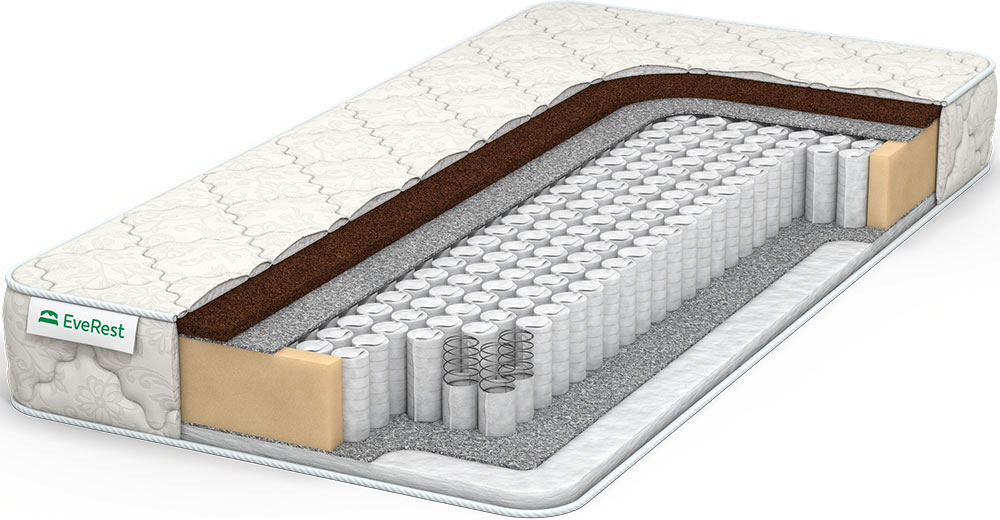 Пружинный матрас с двумя видами наполнителя: койры и холлофайбера, обеспечивающих разностороннюю жесткость спальных поверхностей и ортопедический эффект.