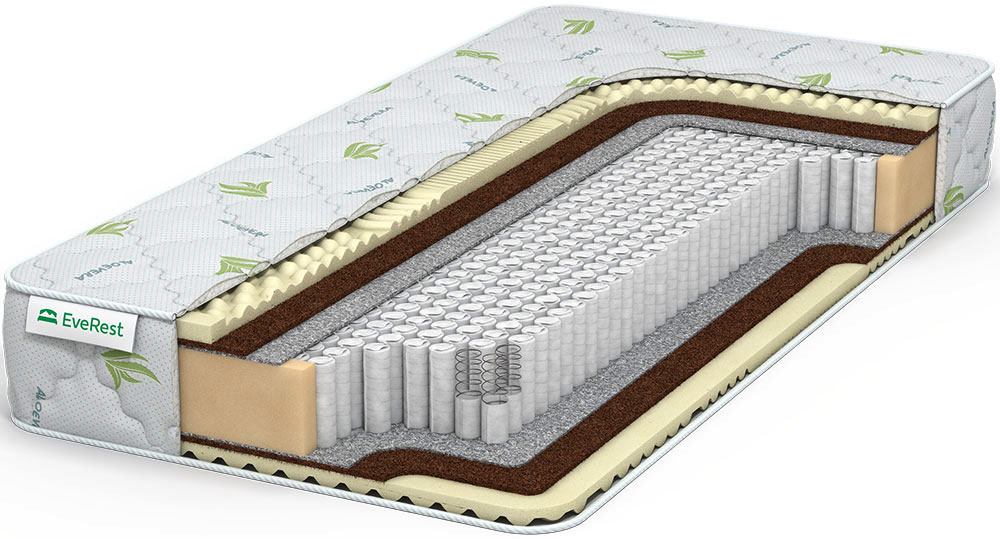 Пружинный матрас с ортопедическими и массажными свойствами средней жесткости. В качестве наполнителя в нем использован семизональный латекс и койра.